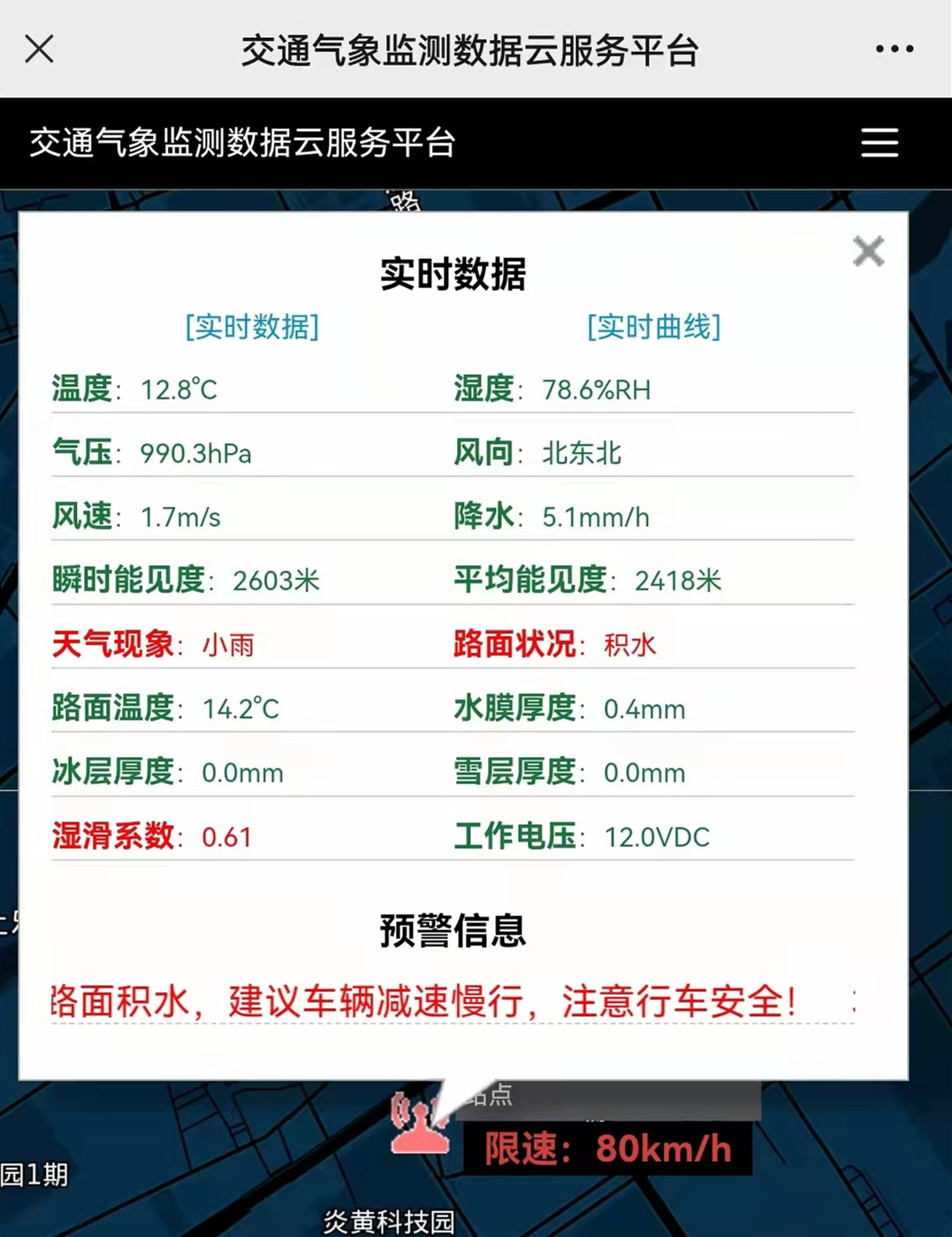 霧天情況下,在實時數據中對于平均能見度會顯示紅色字體,其能見度距離也有具體展現,并提示預警信息:能見度小于多少米,限速多少,保持車距等相關提醒。