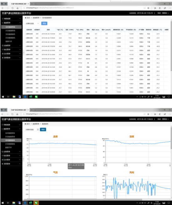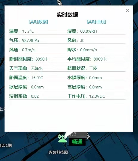 在監(jiān)測平臺中,實時數據主要展現數據有:溫度、氣壓、風速、瞬時能見度、天氣現象、路面溫度、冰層厚度、濕滑系數、濕度、風向、降水、平均能見度、路面狀況、水膜厚度、雪層厚度、工作電壓等,不同的氣象要素可根據需求進行定制。